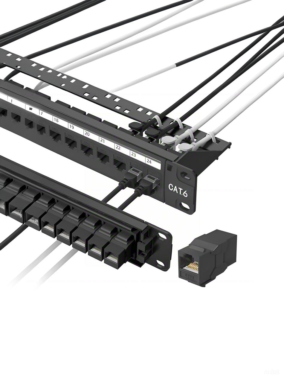 A passive, mounted hardware assembly used in structured cabling to terminate and organize a group of RJ45 (Ethernet) copper cables, such as Cat5e, Cat6, or Cat6a.